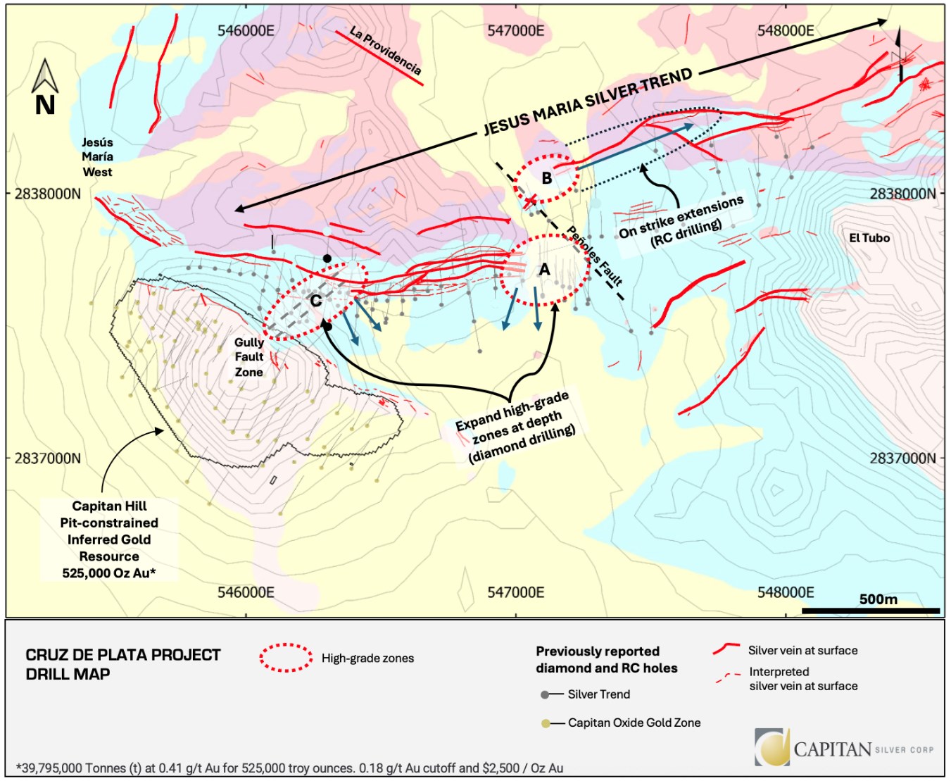 Capitan has commenced an aggressive 60,000-metre drilling campaign at its Cruz de Plata project for 2026, which represents the largest drill program in the Company's history and four times (4x) the size of the Company's 2025 drill program. The new core rig is the second of three (3) core rigs that are planned to arrive at the property. This core rig will be targeting high-grade silver mineralization on the western end of the Jesus Maria Silver Trend, including the Gully Fault Zone, central portions of the Jesus Maria vein, and beneath portions of Capitan Hill, and will focus on extending the mineralized envelope deeper, while providing more information about mineralization intersected in previously reported drill holes 21-JMRC-01, 21-JMRC-10, and JM-DDH-13-06 (see Figure 1, Target C).