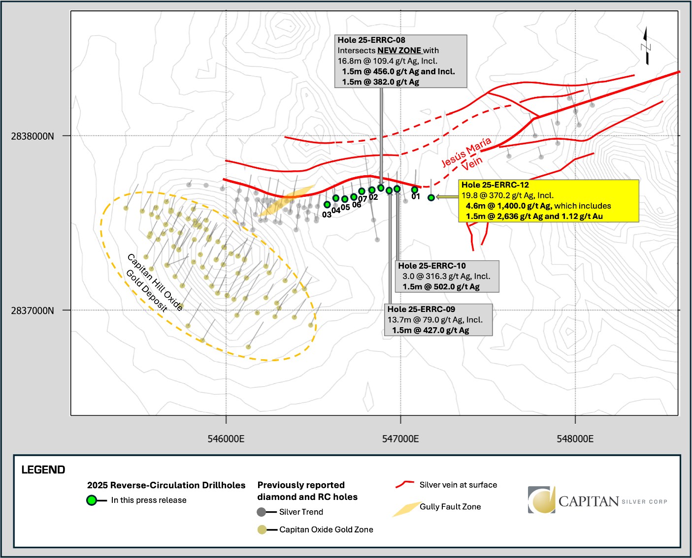 Holes 25-ERRC-12, 25-ERRC-08 and 25-ERRC-10 have intersected new high-grade structures to the north of the Jesús María vein. Hole 25-ERRC-12 cut 1.5 m of 479.0 g/t Ag with 0.13 g/t Au within a broad interval of 25.9 m of 69.2 g/t Ag and 0.17 g/t Au. Hole 25-ERRC-08 intersected a similar zone with 456.0 g/t Ag over 1.5m and also 1.5 m of 385 g/t Ag within a wider interval of 109.4 g/t Ag over 16.8 m. In addition, hole 25-ERRC-12 cut an additional zone further at depth with 1.5 m of 171.5 g/t Ag, while hole 25-ERRC-10 cut 1.5 m of 166.5 g/t Ag within 3.0 m of 116.3 g/t Ag.