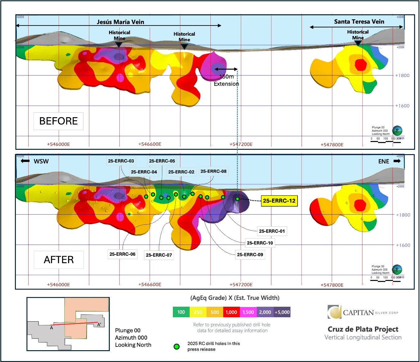 The hole cut an approximate 15-20 m wide zone of mineralized intrusive dyke and breccia, which returned 2,636 g/t Ag over 1.5 m within a wider interval of 1,400 g/t Ag over 4.6 m within a wider envelope of 370.2 g/t Ag over 19.8 m. This intersection not only represents one of the highest-grade intervals drilled on the project, but it also appears to be a new style of high-grade silver mineralization along the Jesús María trend. Figure 2 displays the impact that drilling has had on the program to date, with a new high-grade shoot developing around hole 25-ERRC-01 and increasing in size and intensity towards hole 25-ERRC-12, representing an approximate on-strike distance of 150 m. This zone remains open at depth and along strike to the east. Follow-up drilling has been initiated in this area, with results pending.