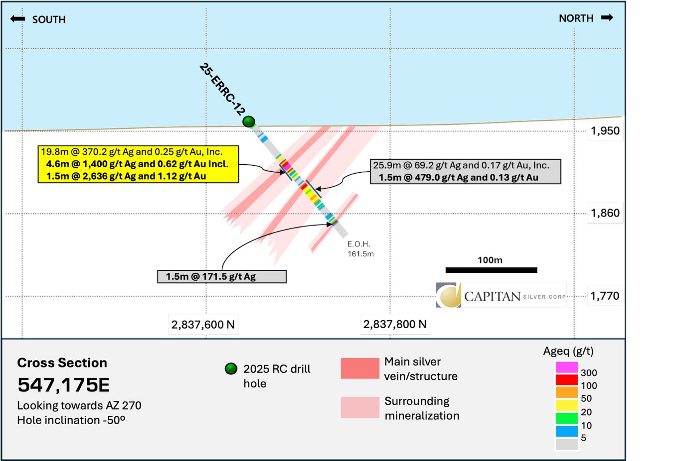 - Hole 25-ERRC-08 intersected 456 g/t Ag over 1.52 m and 382.0 g/t Ag over 1.52 m, both within a broader zone of 109.4 g/t Ag over 16.8 m